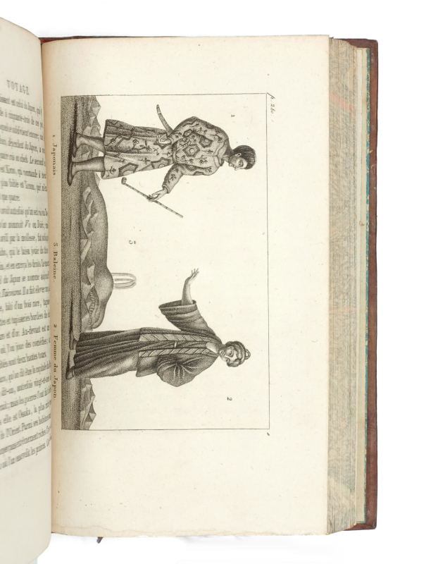 12 volumes 8vo (198 x 125 mm) engraved portrait frontispiece of Christopher Columbus, 2 nn.ll., XVI, 609 pp., 1 nn.l. (errata), 1 engraved folding map, 5 engraved plates and 1 engraved portrait (Vasco da Gama) for volume I; 2 nn.ll., engraved frontispiece (death of Magellan), 472 pp., 1 engraved folding map, 4 engraved plates for volume II; 2 nn.ll., engraved portrait of Gemelli Careri, 592 pp., 1 engraved folding map, 6 engraved plates for volume III; 2 nn.ll., 500 pp., 1 engraved folding map, 5 engraved plates for volume IV; engraved portrait frontispiece of Anson, 496 pp., 1 engraved folding map, 3 engraved plates (including a portrait of Christopher Columbus) for volume V; 447 pp., 1 engraved folding map, 4 engraved plates for volume VI ; engraved portrait frontispiece of Bougainville, 469 pp., 5 engraved plates for volume VII ; engraved portrait frontispiece of Captain James Cook, 432 pp., 6 engraved plates for volume VIII; 482 pp., 10 engraved plates for volume IX ; 575 pp., 13 engraved plates for volume X ; engraved portrait frontispiece of La Pérouse, 504 pp., 2 engraved plates for volume XI ; 324 pp., 7 engraved plates for volume XII. Contemporary tree calf, decorative gilt border on covers, flat spines richly gilt in Bozérian style, lettering pieces in light brown morocco, marbled edges.