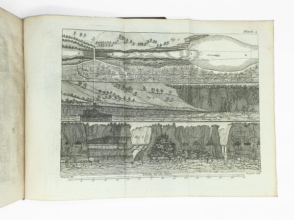 To make navigation possible, Boissel de Monville carried out detailed surveys and proposed improvements to the river’s course. He used a series of beautiful engraved plates to illustrate his points. The author himself travelled down the Rhône from Fort l’Écluse to Génissiat to prove that the river was definitely navigable. The fold-out map showing part of the course of the Rhône is based on the one given by the famous cartographer Cassini. The following 17 plates, engraved from the author’s drawings by Picquenot and other artists, illustrate bridges, waterways with shoreline and bank surveys, details of dam construction and picturesque views.