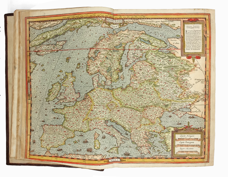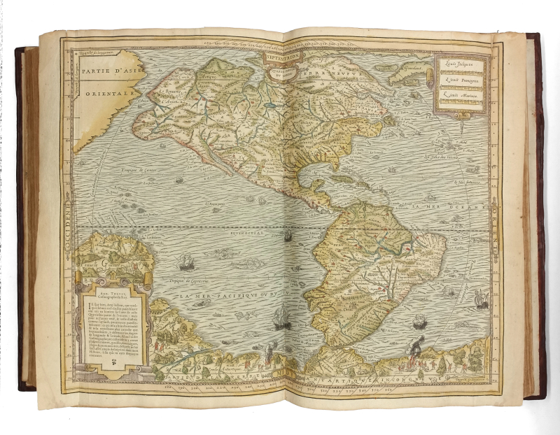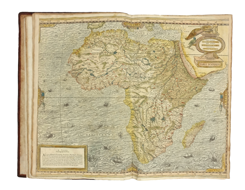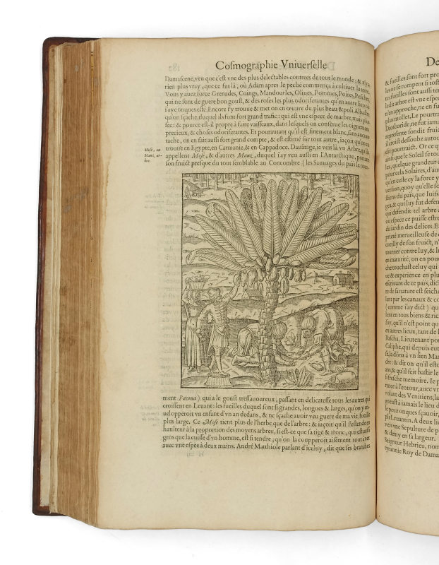 A French Franciscan priest, historian, and cosmographer, André Thevet entered the Franciscan order around 1528. From 1548, he spent five or six years traveling from Venice, visiting Greece, Turkey, Rhodes, Palestine, Cyprus, and Malta. In 1551, he accompanied Guillaume le Testu on a voyage to Brazil and brought back to Europe, among other things, the use of tobacco. In May 1555, he embarked as chaplain with Villegagnon’s first expedition, which established a French colony on the Brazilian coast. Thevet returned to France in June 1556. In 1558, he was appointed chaplain to the queen and, under Henry II and Charles IX, received the titles of cosmographer and royal historian. This very rare book is illustrated with 288 woodcuts in the text and four double-page maps, colored at the time in this copy. “The map of America bears the indication ‘France Antarque’ near the Rio de Janeiro region and the names ‘Cap de Frie’ and ‘Rio de Janeiro’.