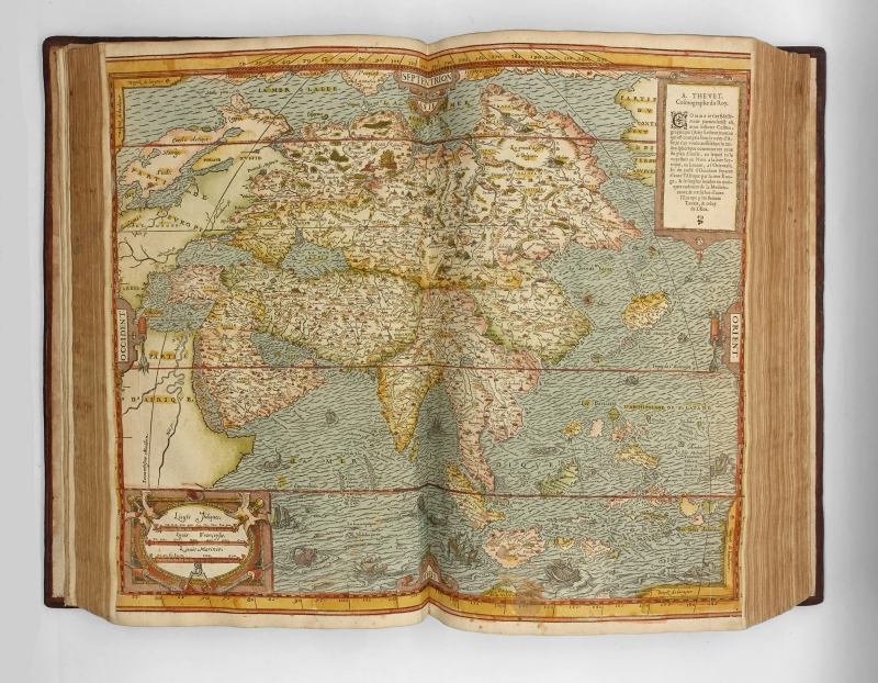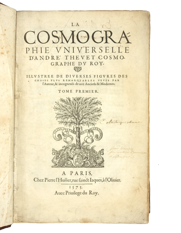 Lestringant, André Thevet, pp. 374-376, no. 14; Sabin 95335; Atkinson 249n; Borba de Moraes II, pp. 859-860; Arents, I, 8 & 21; Adams T/623; Mortimer French, 517; JCB (3) I:261; Brun p. 312 (title addressed to G. Chaudière); Alden-Landis, 575/32.