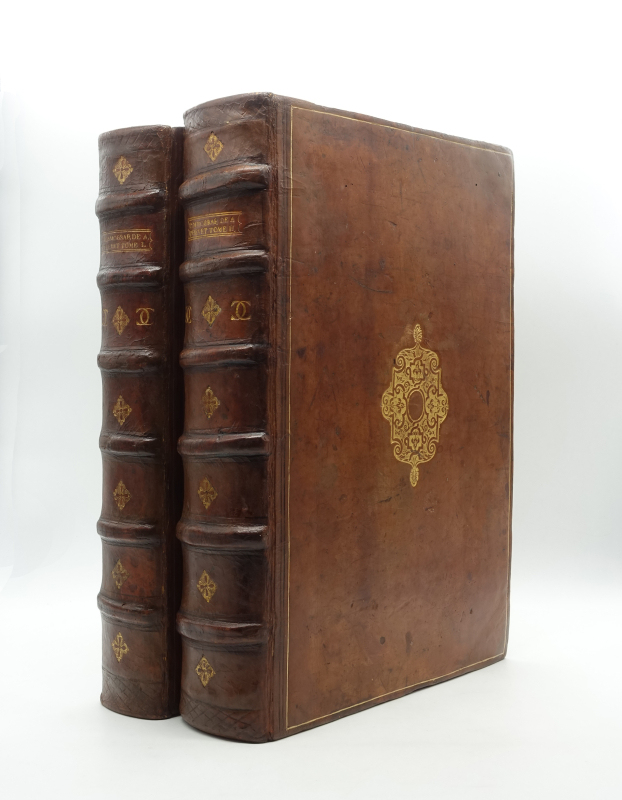 2 folio volumes (371 x 232 mm) of 18 unnumbered leaves (title, epistle, preface, ode, tables), 467 numbered leaves, 12 unnumbered leaves. (table), 1 portrait, 2 colored folding maps for volume I; 8 unnumbered leaves, numbered leaves from 469 to 914, then 912 to 936, then 903 to 1025 (without interruption of text), 17unnumbered leaves and 2 colored folding maps for volume II. Brown calf, gilt fillet framing boards, gilt central medallion, spine gilt with raised bands, gilt title (contemporary binding).