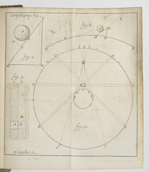 Dedicated to Bossuet, the work is illustrated with six engraved folding plates and a vignette (repeated) depicting gravity, with the motto : “Retombera-t-il ?”.
