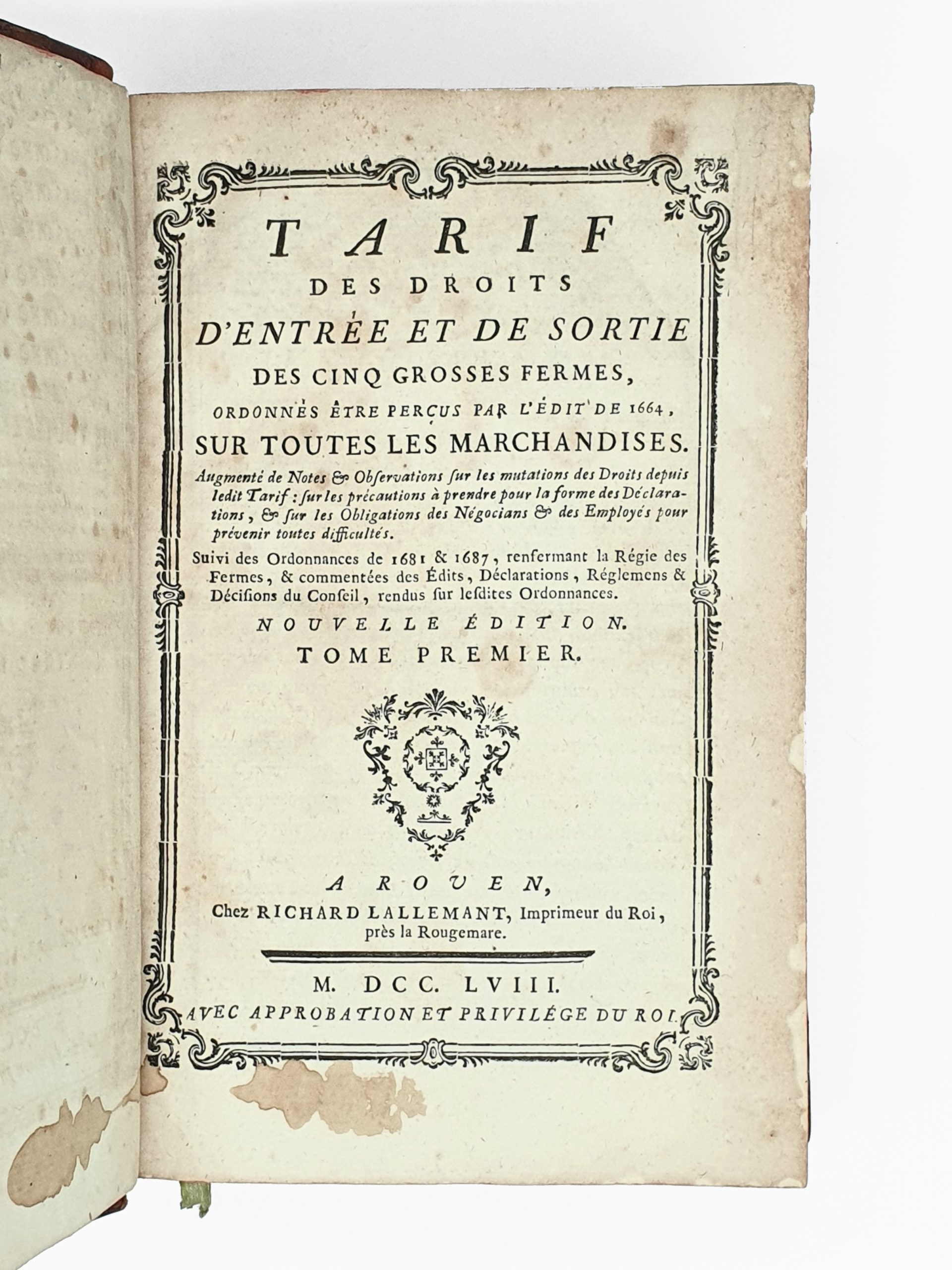 ANONYME TARIF des Droits d’entrée et de sortie des cinq grosses fermes, ordonnés être perçus par l’Edit de 1664 sur toutes les Marchandises. Augmenté de Notes & Observations sur les mutations des Droits depuis ledit Tarif… Suivi des Ordonnances de 1681 & 1687, renfermant la Régie des Fermes…