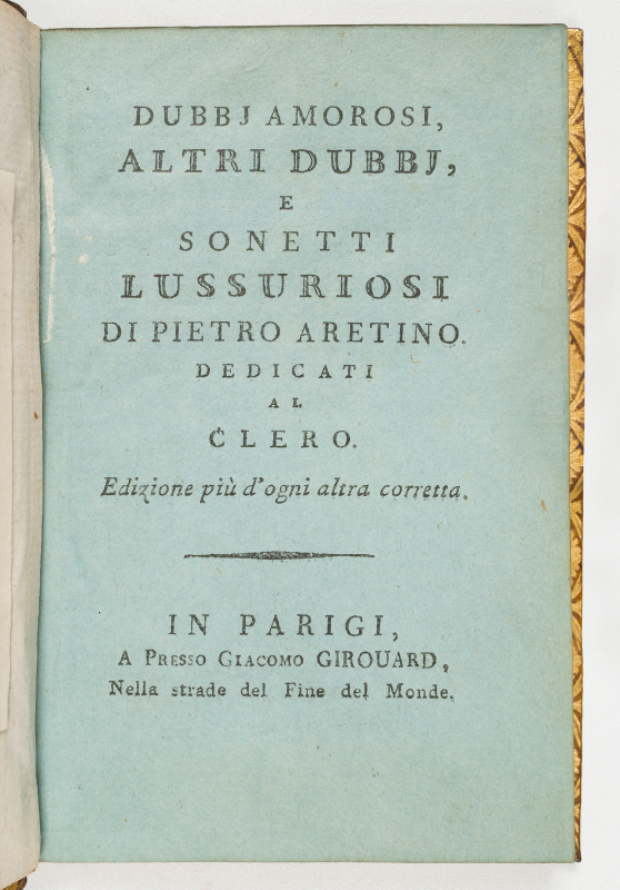 Le colophon n’indique que des exemplaires sur vélin et ne fait pas mention de papier de couleur (‘ne sono stampati 50 esemplari in carta detta Vellin’). Brunet et Pia citent cette édition avec un titre donnant Rome comme lieu d’impression, également sortie des presse de Girouard. Le présent exemplaire débute par la même dédicace citée par Pia aux cardinaux et d’autres dignitaires.