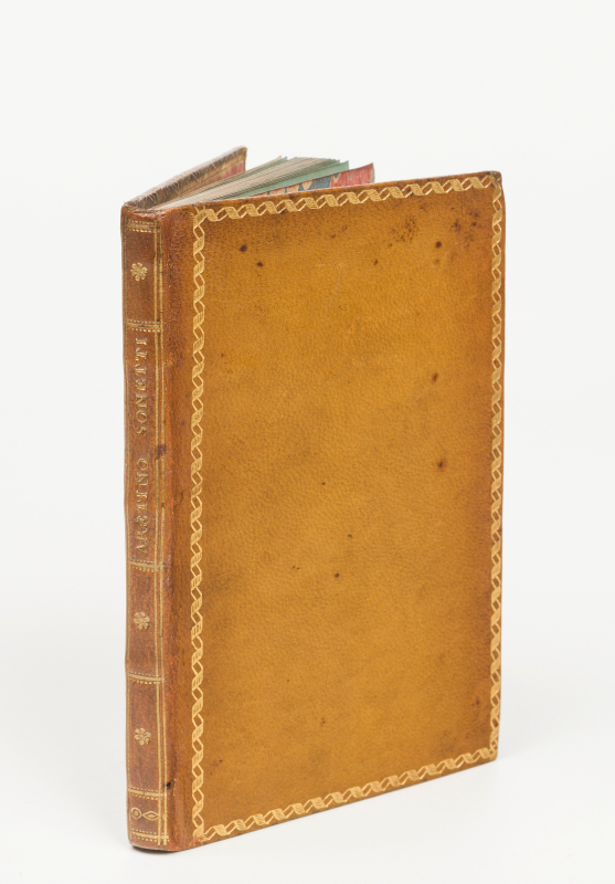 Petit in-12 (127 x 81 mm) 78 pp. Imprimé sur papier bleuté. Maroquin citron, frise à la roulette en encadrement doré, dos lisse avec titre en long, tranches dorées (reliure de l’époque).