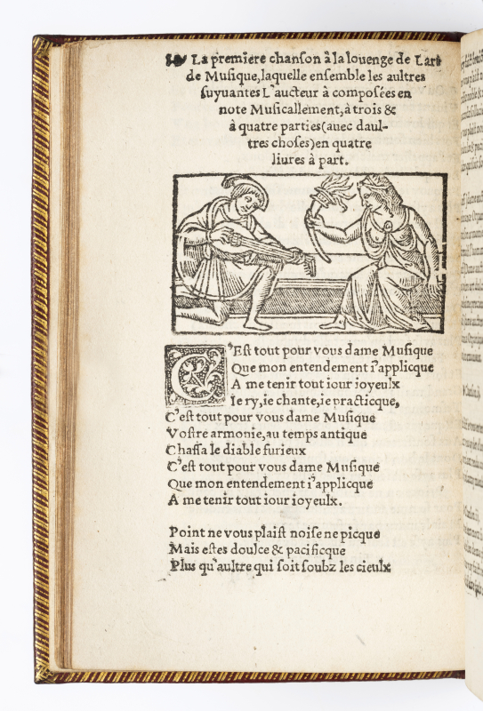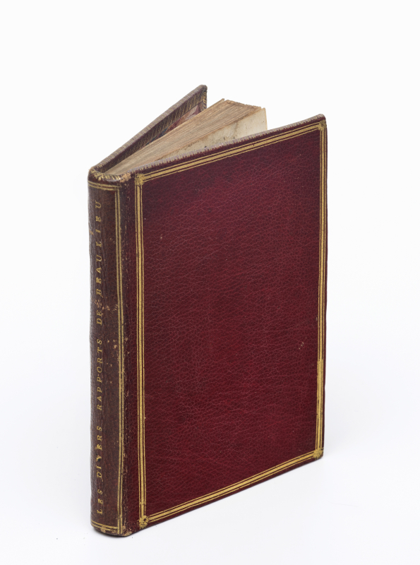 In-12 (125 x 85 mm) de 88 ff.n.ch. Collation : A-L8. Maroquin rouge, triple filet doré d’encadrement, dos lisse avec titre doré en long, roulette sur les coupes, tranches dorées (reliure du XVIIIe siècle).