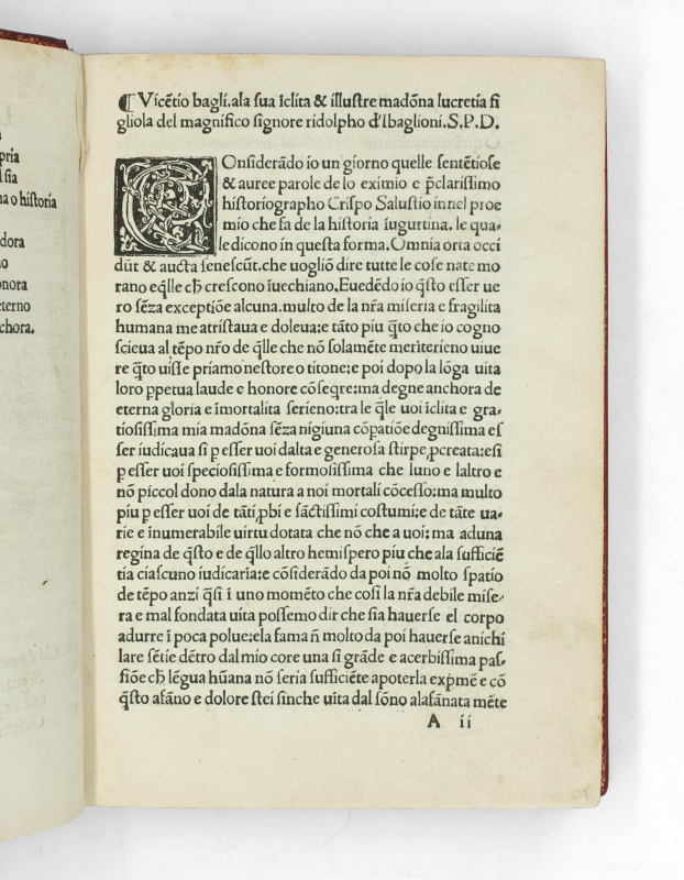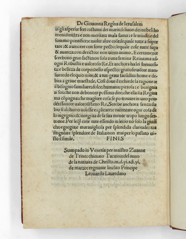 Il s’agit de la première diffusion imprimée de cette version italienne du texte de Boccace. Il fut tout d’abord traduit par le moine augustinien Antonio di San Lupidio (vers 1371), puis adapté par Niccolò Sassetti. Cette édition de Giovanni Tacuino (Zuan da Trino) reprend cette traduction et l’attribue fictivement à Vincenzo Bagli. Elle marque le regain d’intérêt pour les œuvres latines de Boccaccio au XVIe siècle.