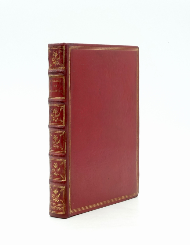 In-4 (202 x 144 mm) de 154 feuillets (A6, B8-T8, V4). Maroquin rouge, triple filet d’encadrement sur les plats, roulette intérieur, dos à nerfs orné, tranches rouges mouchetées (reliure moderne).