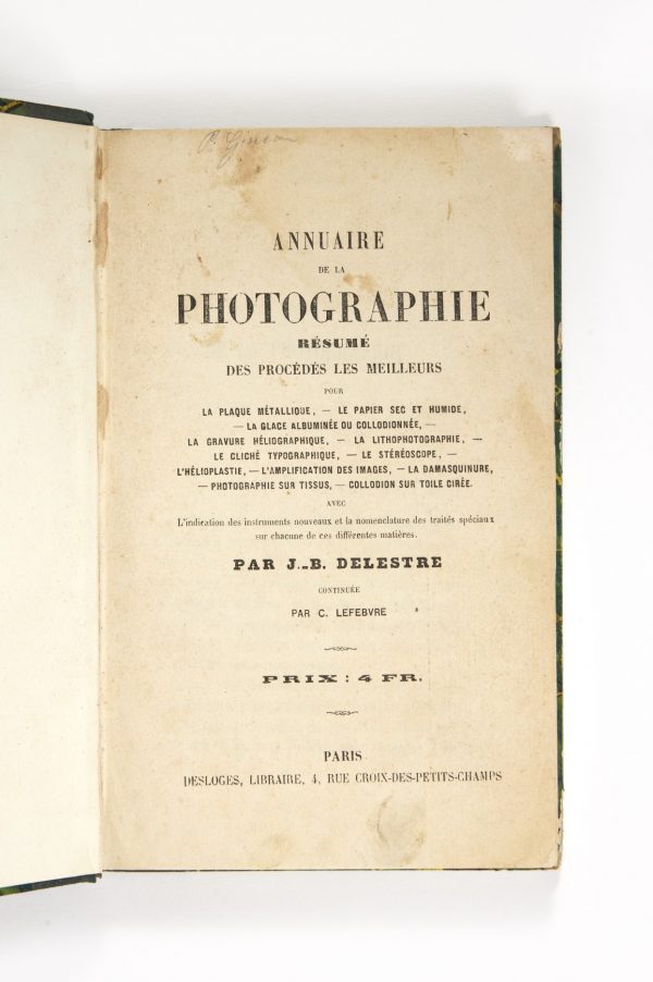 DELESTRE Gustave Annuaire de la photographie. Résumé des procédés les meilleurs pour la plaque métallique, le papier sec et humide, la glace albuminée ou collodionnée, la gravure héliographique, la lithophotographie, le cliché typographique, le stéréoscope, l’hélioplastie, l’amplification des images, la damasquinure, photographie sur tissus, collodion sur toile cirée. Avec l’indication des instruments nouveaux et la nomenclature des traités spéciaux sur chacune de ces différentes matières. Continués par Casimir Lefebvre.