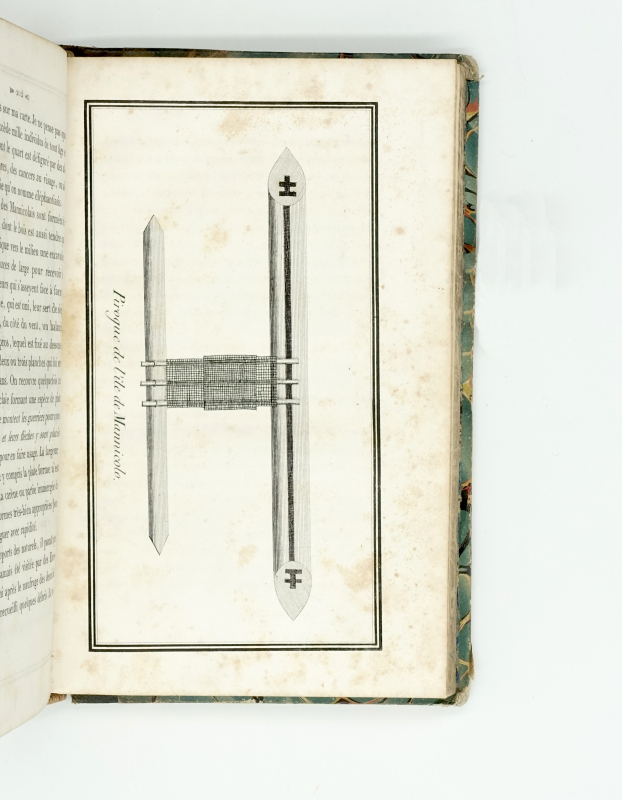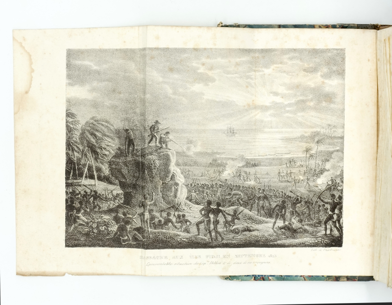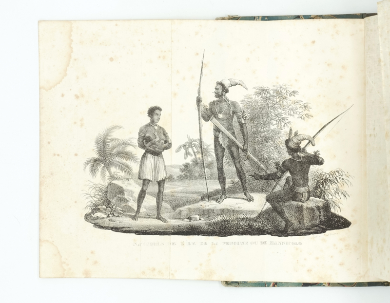 Elle est ornée de 4 planches (3 dépliantes) lithographiées en noir par Engelmann, dont les deux frontispices et la carte dépliante montrant l’ile de Mannicolo (Vanikoro), la planche simple montre le modèle d’une pirogue.