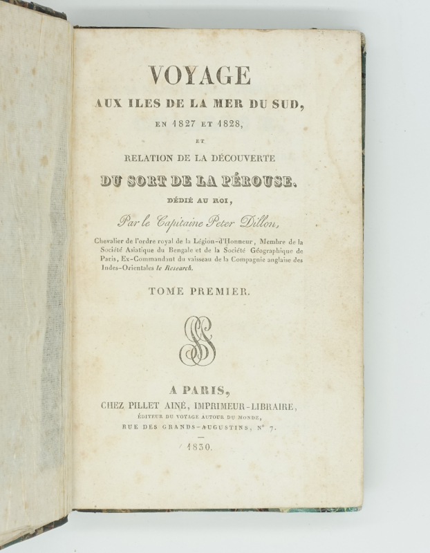 « Dillon was engaged in the sandalwood trade between the West Pacific islands and China, and between 1822 and 1825 was employed in the timber trade for the East India market. Returning to Tikopia in 1826 with his ship St Patrick, en route from Chile to India, he was offered a sword of French manufacture, evidently from the wreck of La Pérouse’s ships » (Howgego).