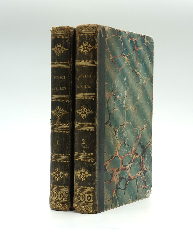 2 volumes in-8 (198 x 121 mm) de 2 ff.n.ch., LX, 294 pp., 1 f.n.ch., frontispice dépliant pour le volume I; 2 ff.n.ch., 361 pp., 1 f.n.ch., 3 planches (frontispice et une carte dépliante, une planche simple) pour le volume II. Demi-basane verte, roulette et fleurons dorés (reliure de l’époque).