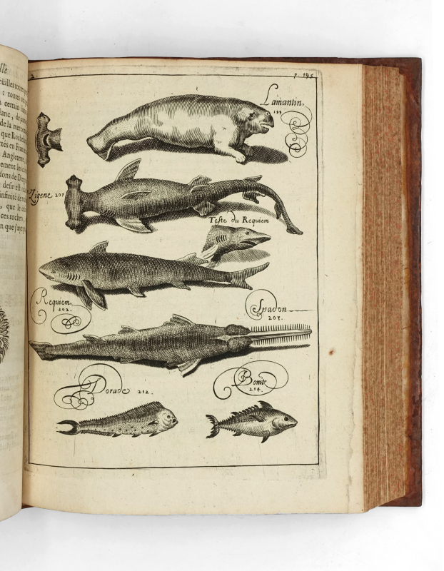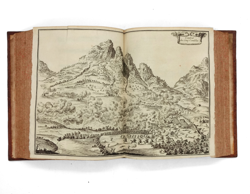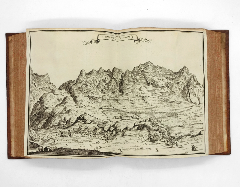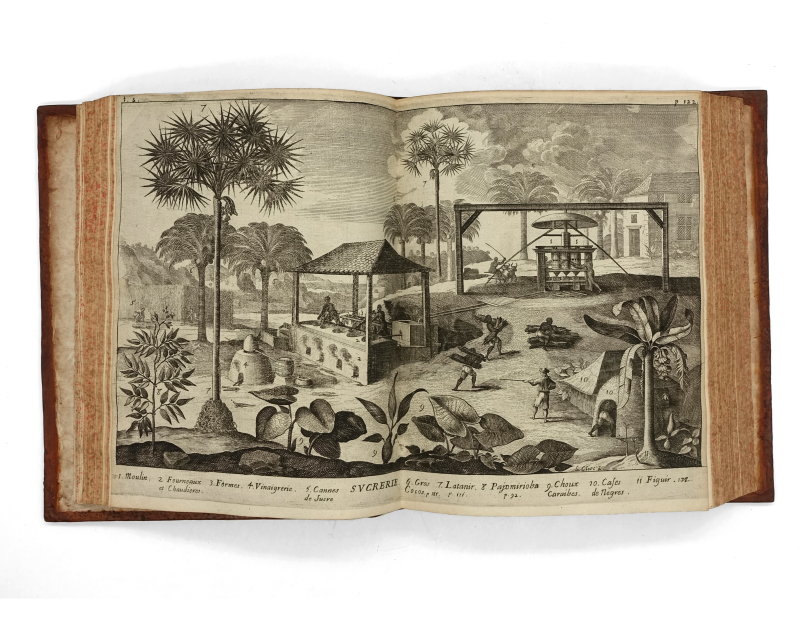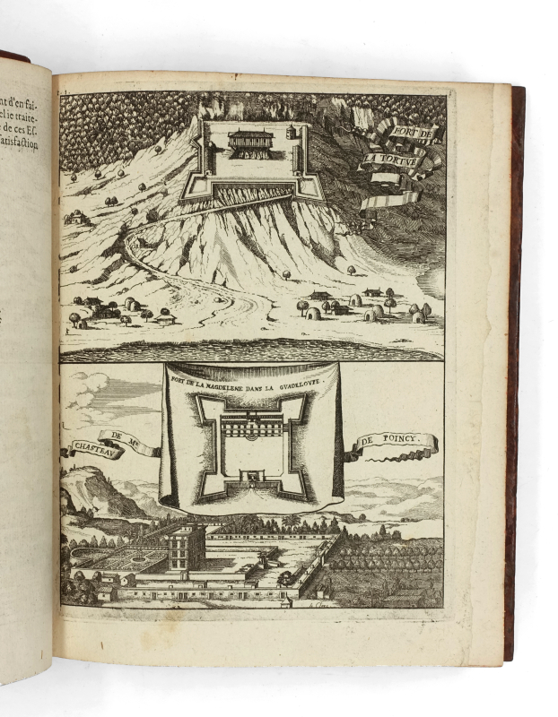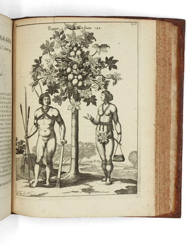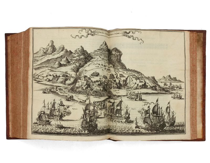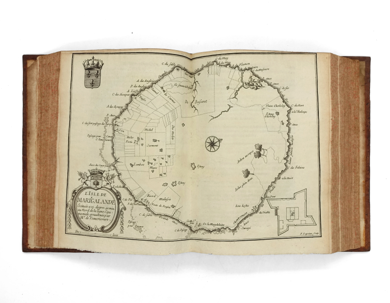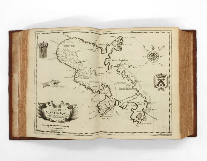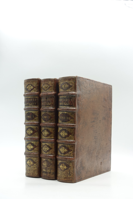 4 tomes en 3 volumes in-4 (233 x 186 mm) titre frontispice gravé, armoiries gravées de Harlay, 10 ff.n.ch. (titre, préface, table), 593 pp. (mal chiffrés 935), 1 f.n.ch. (errata), 3 cartes à double page pour le volume I ; titre frontispice gravé, 8 ff.n.ch. (titre, épistre, table, privilège), 539 pp., 14 planches (dont 5 à double page, 2 planches de botanique tirés sur une feuille) pour le volume II ; 9 ff.n.ch. (faux-titre, titre, armoiries gravées de Bignon, épître, approbation, privilège, avis au lecteur), 317 pp., 4 ff.n.ch. (table), 2 cartes à double page pour le tome III ; 4 ff.n.ch. (titre, armoiries gravées de Bignon, épistre), 362 pp., 7 ff.n.ch. (table, privilège), 4 planches (dont 2 dépliantes et 2 doubles) pour le tome IV. Veau moucheté, dos à nerfs orné, tranches jaspées (reliure de l’époque).
