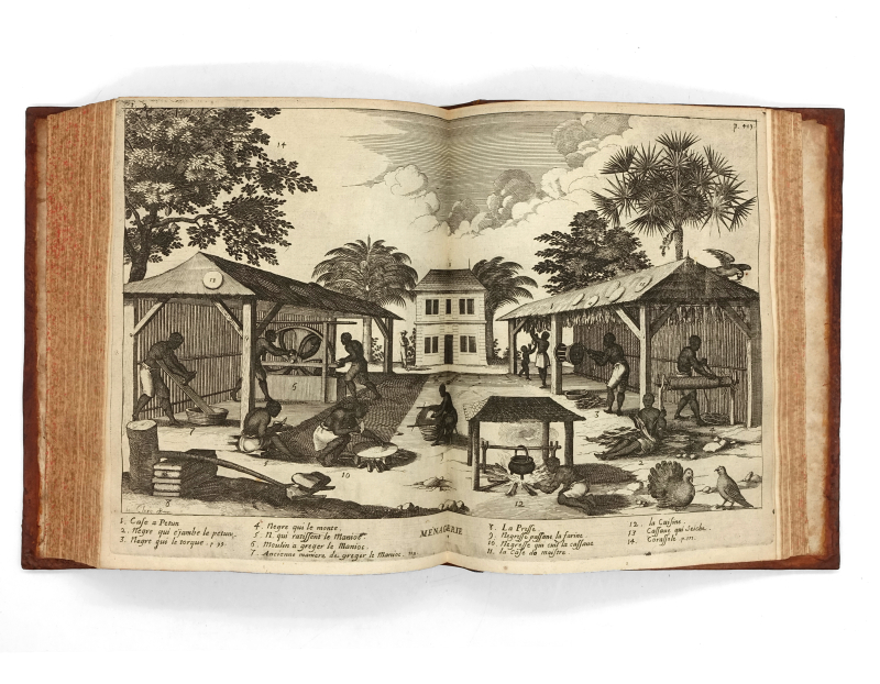 Exemplaire bien complet des 2 titre-frontispice gravés, 3 planches d’armoiries (1 de Harlay, et 2 de Bignon), de 5 cartes à double page et de 18 planches (dont 7 à double page et 2 dépliantes ; exceptionnellement les 2 planches de botanique du volume 2 sont restées unies sur une feuille qui ne fut pas découpée). Dans le tome 4, les inscriptions de la planche « Combat de Cayenne » sont inversées alors de que dessin ne l’est pas. Il s’agit peut-être d’un premier tirage de cette planche, les inscriptions ayant été corrigés dans les tirages suivants.