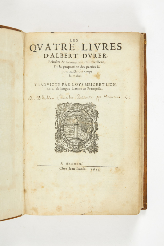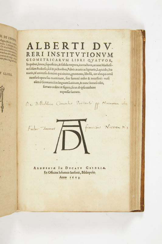 Cet exemplaire a appartenu à l’éminent scientifique Jean-François Nicéron (1613-1646), dont la signature figure sur l’édition latine de Dürer. L’inscription est datée de trois ans seulement avant la première édition de son principal traité, La Perspective Curieuse, et la reliure porte les armoiries du couvent auquel il appartenait. Les provenances d’artistes, d’architectes et de théoriciens importants sont parmi les plus rares à avoir survécu, sans doute parce que leurs livres ont été utilisés jusqu’à l’usure ; et les œuvres dont le sujet est directement lié à l’intérêt que nous porte leur propriétaire, dont la provenance est incontestable, comme ici, sont encore plus rares : c’est dans cet exemplaire que Nicéron a lu son Dürer, tirant de l’artiste et théoricien de Nuremberg les principes et les techniques qu’il allait développer dans son propre travail, surtout connu pour le développement de l’anamorphose. Comme cet exemplaire se trouvait dans la bibliothèque conventuelle des Minimes à Paris, il n’est pas improbable qu’il ait également été utilisé par un autre membre éminent de cet ordre intéressé par la perspective, Marin Mersenne (1588-1648).