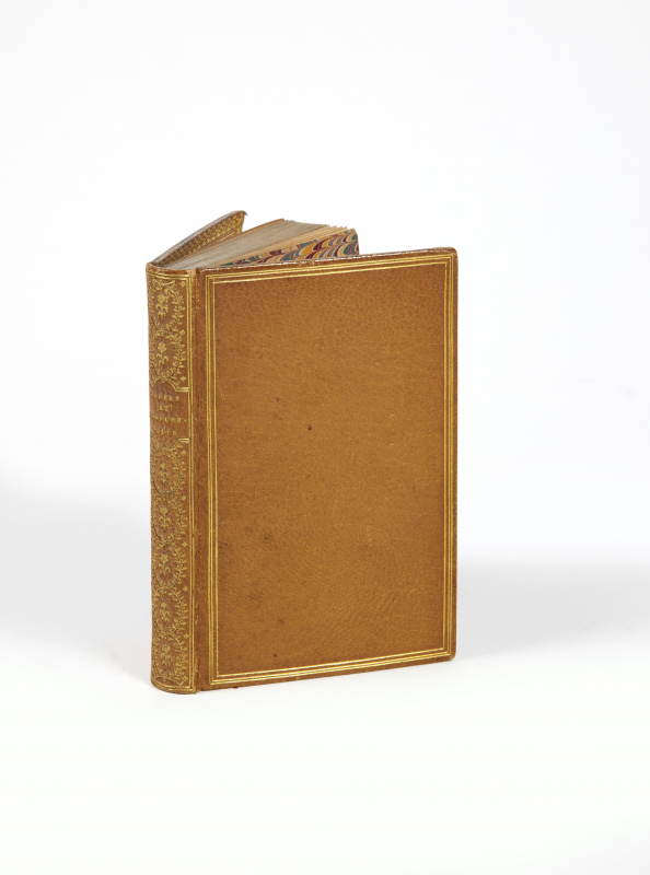 In-16 (111 x 70 mm), de 282 pp., marque d’imprimeur gravée sur bois sur la page de titre. Maroquin citron, triple filet doré en encadrement des plats, dos lisse orné de petits fer floraux (marguerite et lys), roulette intérieure, tranches dorées (Trautz-Bauzonnet).