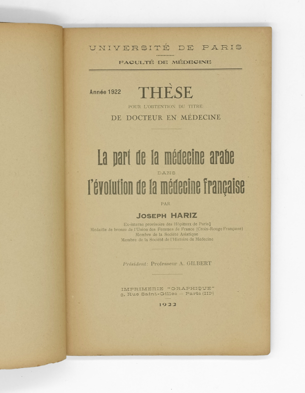 HARIZ Joseph La part de la médecine arabe dans l’évolution de la médecin française. Thèse.
