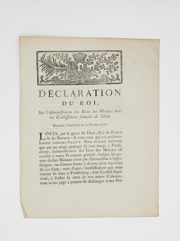 INDE Déclaration du roi, sur l’administration des biens des mineurs dans les établissemens françois de l’Inde. Donnée à Versailles le 22 février 1777.