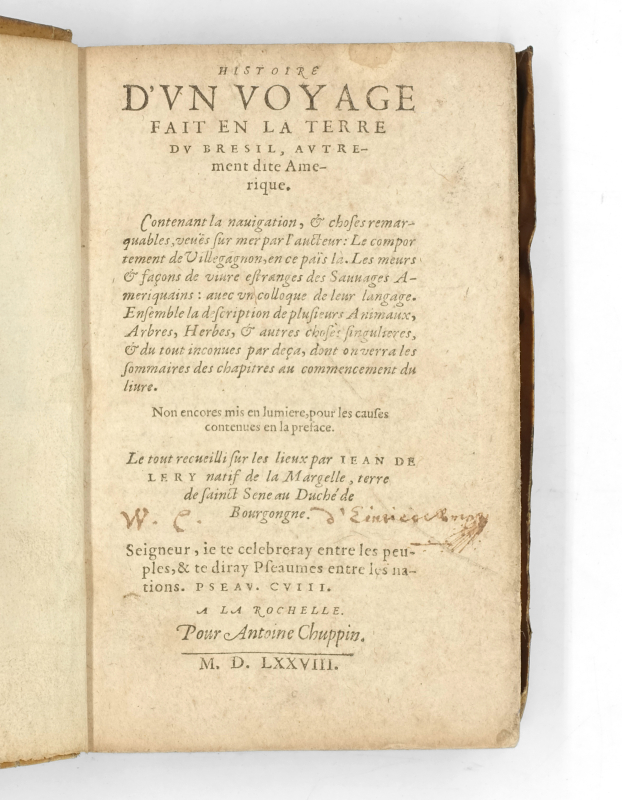 Cette première édition très rare commence par une épître dédicatoire à l’amiral de Coligny. « Lery, ministre protestant, s’étoit embarqué avec deux autres ministres, pour aller établir une colonie de réfor-més au Brésil, sous la protection de l’amiral de Coligny, qui y avoit fait bâtir un fort, et auquel il a dédié sa rela-tion. Ce projet n’ayant pas réussi, Lery revint en France ety publia son Voyage, où il relève vivement toutes les erreurs qui se trouvent dans la France antarctique, de Thevet. L’esprit d’intolérance dont étoit animée alors la cour de France, qui tenoit pour suspects tous les ouvrages sortis de la plume d’un protestant, vraisemblablement ne permit pas à Lery d’indiquer la ville où il avoit fait imprimer deux fois sa relation. […] La relation de Lery décèle un observateur supérieur son siècle, soit par l’étude qu’il paroit avoir faite du caractère et des mœurs des Sauvages, soit par ses judicieuses remarques sur tous les objets tenant à l’histoire naturelle.[…] Sous le titre de Colloque, sa relation renferme une espèce de vocabulaire assez étendu de la langue brésilienne. En parlant de l’expédition de Villegagnon, qui avoit formé le premier établissement de la petite colonie du Brésil, le président De Thou fait l’éloge des lumières a de la véracité de Lery. » (Boucher de la Richardière, VI, 271-272.