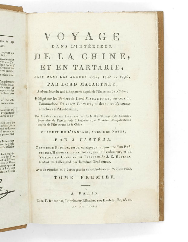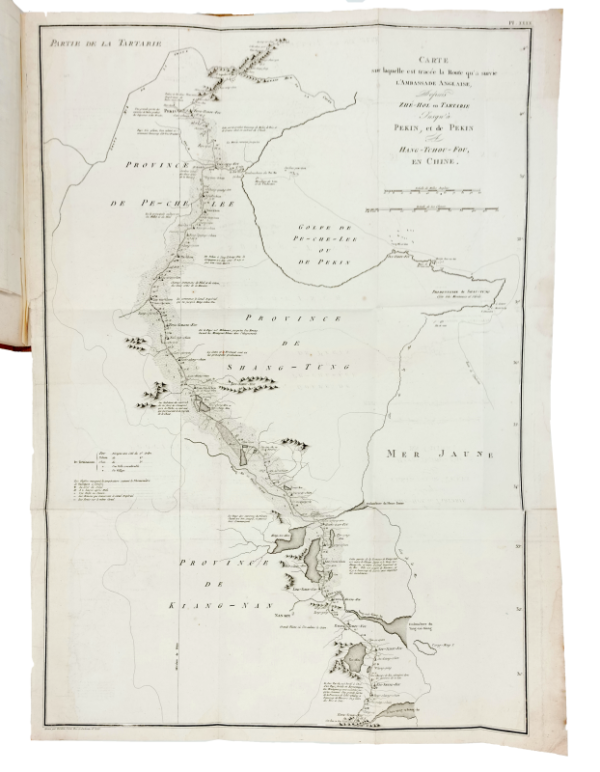 L’édition la plus complète du célèbre voyage de Macartney. Elle contient ici pour la première fois la traduction du récit de Johann Christian Hüttner qui fit partie de l’ambassade en Chine. Lord Macartney, chargé d’établir des relations commerciales avec la Chine, dut traverser une grande partie du pays pour rencontrer l’empereur Kien-Loung en Mandchourie. Sa mission ne fut pas un succès politique, mais il en rapporta d’intéressantes observations scientifiques sur ces régions. La relation de cette ambassade fut publiée par Staunton, secrétaire de Lord Macartney d’après les papiers de ce dernier et ceux d’Erasme Goer (qui se rendit au Japon). L’atlas et bien plus important par rapport à l’édition précédente qui ne comptait que 32 planches.