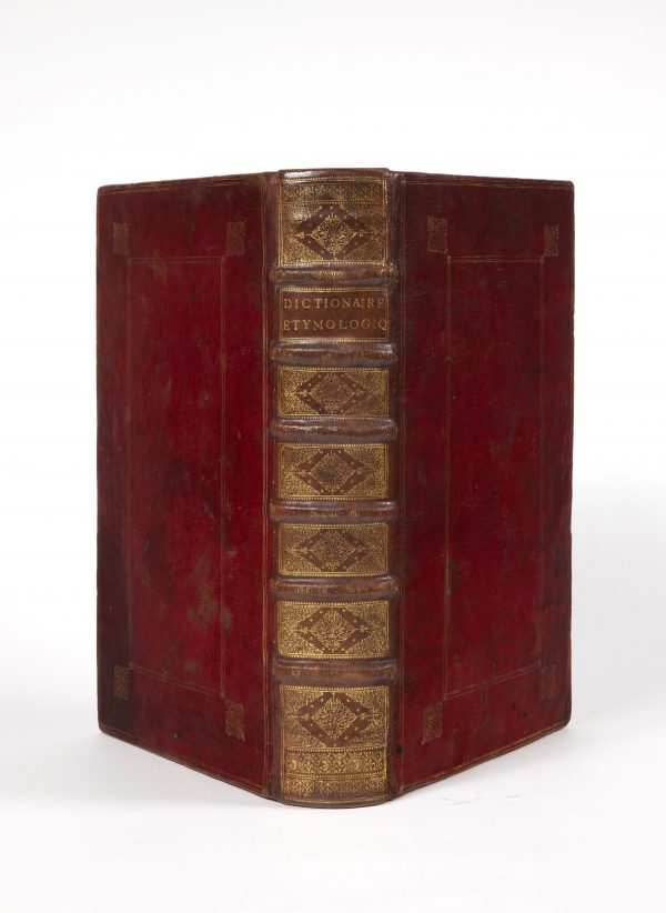 Seconde édition amplement augmentée des Origines de la langue française du poète et critique Gilles Ménage (1613-1692). La seconde partie, précédée d'une page de titre particulière, renferme Les Origines françoises de Pierre de Caseneuve, revue par Simon de Valhébert. Elle est orné d'un bandeau gravé sur cuivre par S. Le Clerc, aux armes du dédicataire Jérôme Bignon (1589-1656), juriste, conseiller d'État et maître de la Librairie.