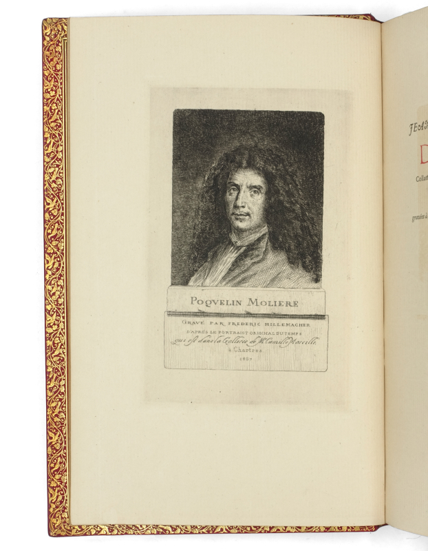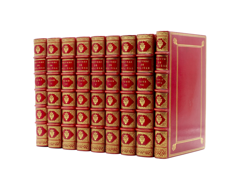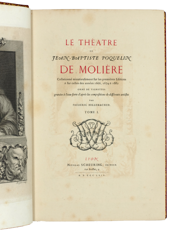 8 volumes grand in-8 (230 x 150 mm) XV, 409 pp., 2 ff.n.ch. (table et avis au relieur), 12 planches supplémentaires pour le volume I ; portrait par Hillemacher, 450 pp., 2 ff.n.ch. (table et avis au relieur), 13 planches supplémentaires pour le volume II ; 455 pp., 2 ff.n.ch. (table et avis au relieur), 12 planches supplémentaires pour le volume III ; 424 pp., 1 f.n.ch. (table), 13 planches supplémentaires pour le volume IV ; 439 pp., 1 f.n.ch. (table), 11 planches supplémentaires pour le volume V ; 411 pp., 1 f.n.ch. (table), 9 planches supplémentaires pour le volume VI ; 447 pp., 2 ff.n.ch. (table et feuillet avec marque d’imprimeur), 9 planches supplémentaires pour le volume VI ; 447 pp., 2 ff.n.ch. (table et feuillet avec marque d’imprimeur), 8 planches supplémentaires pour le volume VII ; 466 pp., 2 ff.n.ch. (table et feuillet avec marque d’imprimeur), 8 planches supplémentaires pour le volume VIII.- Relié à la fin du volume VII : Reception Publica Unius Juvenis Medici in Academia Burlesca Joannis Baptistae Moliere. Editio troisiesma. Lyon, Perrin & Marinet, 1870. Frontisîce en double état (sur vergé teinté et sur chine), 23 pp.- [Avec en reliure uniforme:] Galerie historique des portraits des comédiens de la troupe de Molière gravées à l’eau-forte par Frédéric Hillemacher. Seconde édition. Lyon, Louis Perrin pour Nicolas Scheuring, 1869. X, 196 pp., 1 f.n.ch. (marque d’imprimeur), 33 portraits gravées. Reliure uniforme en maroquin rouge, plats ornés d’un décor à la Duseuil, dos à nerfs, caissons richement ornés, roulette sur les coupes, large roulette intérieure, tranches dorées (étiquette de Lortic à l’intérieur de chaque plat).
