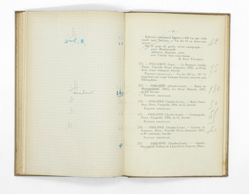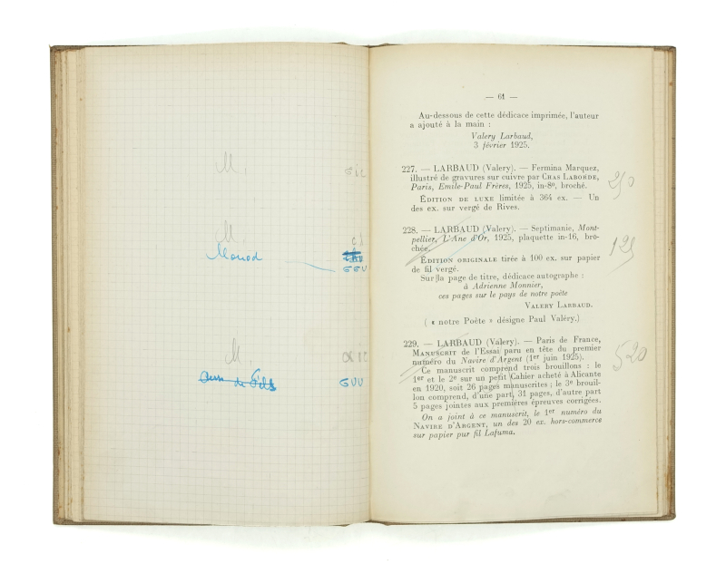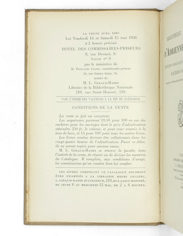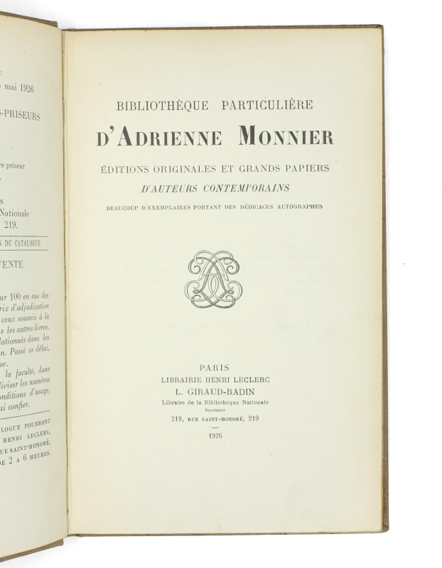 Édition originale, seule publiée, de ce catalogue de vente de la Bibliothèque d’Adrienne Monnier. L’exemplaire de Louis Giraud-Badin, expert de la vente.