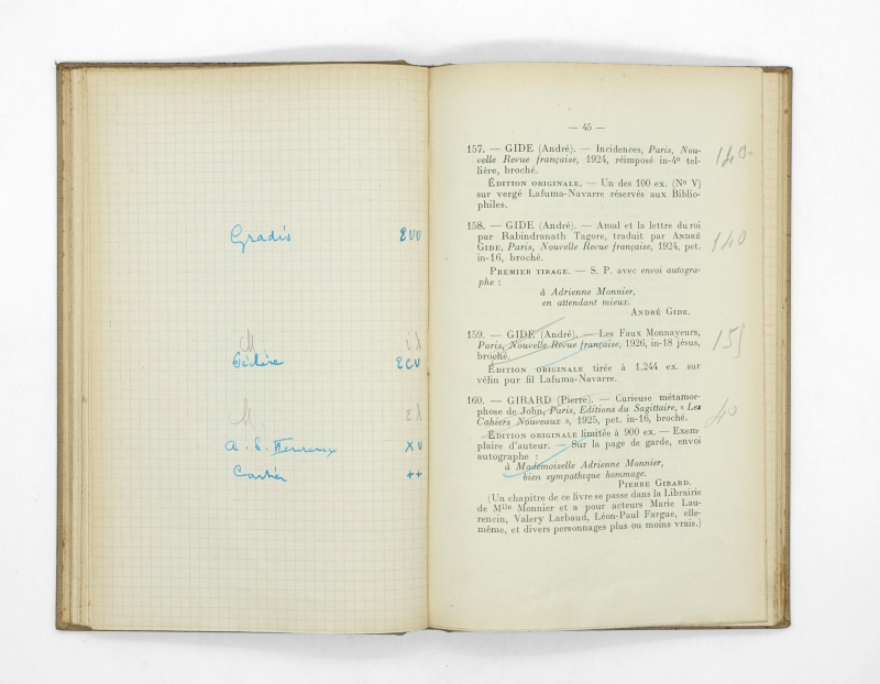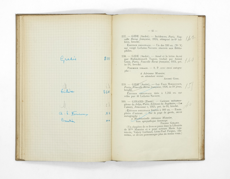 Cet exemplaire condense l’esprit de la vie littéraire de Saint Germain des Près durant l’entre-deux guerre. Il témoigne du métier de libraire envisagé sous un double regard, non seulement grâce à la collection de Monnier mais aussi grâce aux notes de Giraud-Badin.