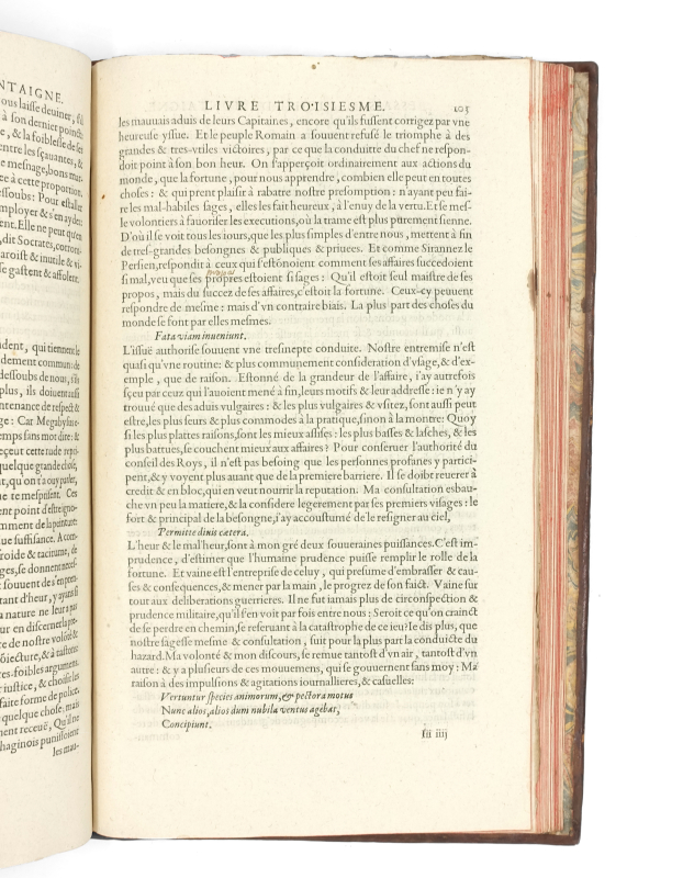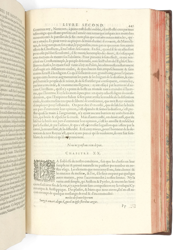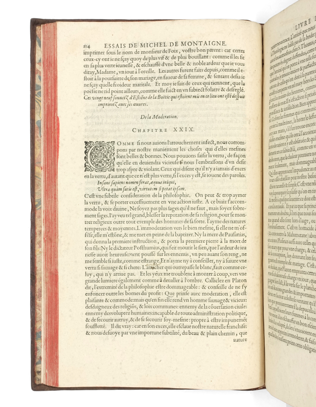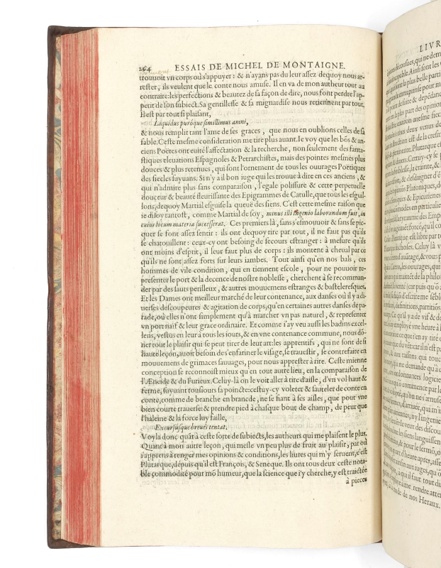 Première édition complète posthume, en partie originale. Elle est donnée par Marie de Gournay « Fille d’alliance » de Montaigne.