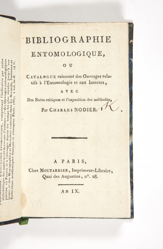 « Avec son deuxième répertoire, la Bibliographie entomologique qu’il publie en 1801, Nodier affronte avec plus d’acuité le vertige des catalogues raisonnés, car il lui faut résoudre à la fois le problème de la classification des insectes et celui de la classification des livres sur les insectes ». En divisant la table des matières en entomologie descriptive et entomologie philosophique, Nodier « donnait une orientation originale à son ouvrage, montrant le passage progressif de la science à l’art et à la littérature. » (Didier Barrière, Nodier, l’homme du livre)