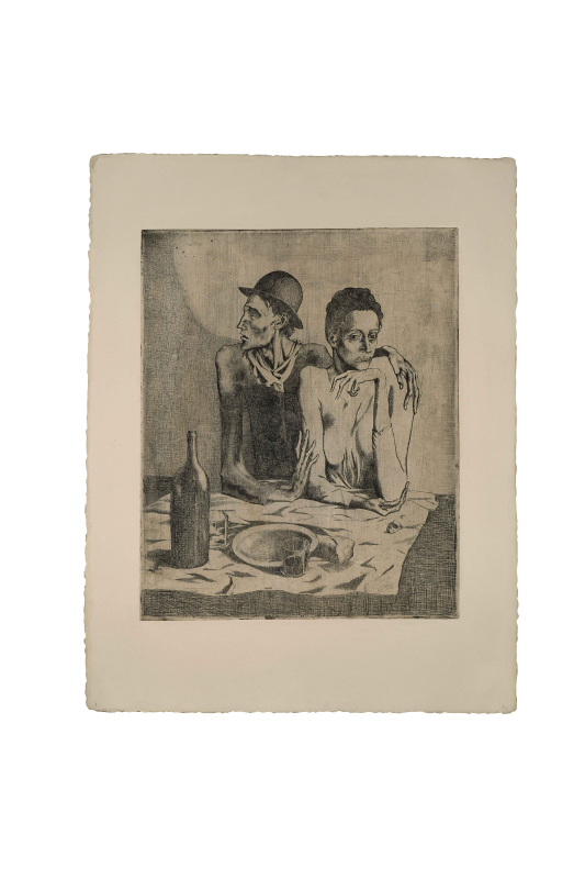 Picasso n’a reçu aucune formation officielle dans les techniques de gravure, et ce n’est qu’en août 1904 à Paris, lorsque le peintre Ricard Canals (1876-1931) lui a montré le processus de l’eau-forte et de la pointe sèche, qu’il a été captivé par ses possibilités. Le Repas frugal, créé en septembre de cette année-là, fut la première tentative sérieuse de Picasso dans le domaine de la gravure — extraordinaire compte tenu de son inexpérience — et est l’une des images les plus célèbres et les plus reproduites du début de carrière de l’artiste. Représentant un couple français émacié assis à une table de café, Le Repas frugal fait référence aux traits émaciés et aux membres allongés des sujets peints par le maître espagnol El Greco (1541-1614), qui a profondément influencé la peinture de Picasso pendant sa période « bleue ». Le Repas frugal était une tentative manifeste de transposer ce style pictural dans le processus de gravure, et a établi un lien essentiel entre le passé espagnol de Picasso et son avenir français.