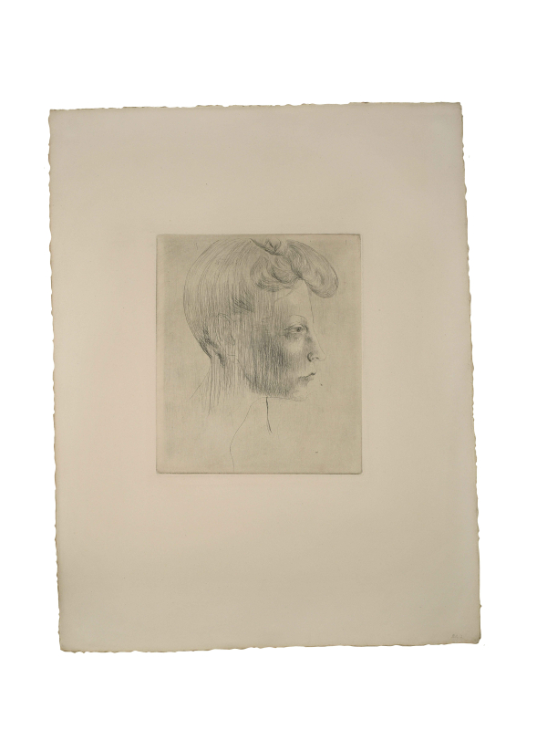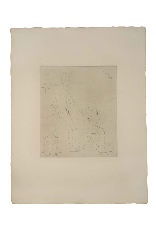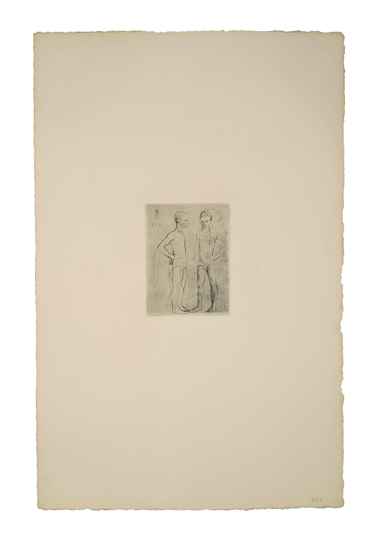L’ordre dans lequel les estampes ont été créées est bien documenté. Nous savons ainsi qu’après avoir réalisé le magnifique portrait néoclassique Tête de Femme de Profil en février, Picasso a créé Les deux Saltimbanques en mars. Cette rare impression signée est l’une des 12 gravées en 1905 par Delâtre pour illustrer certains exemplaires du premier recueil de poèmes d’André Salmon (1881-1969), Poèmes (1905). Vers le mois de mai, Picasso se rendit à Schoorl, aux Pays-Bas, pour rendre visite à l’écrivain néerlandais Tom Schilperoort pendant un mois, au cours duquel il peignit La Belle Hollandaise. De retour à Paris entre juin et août, Picasso réalise l’extraordinaire Salomé. Avec son sujet littéraire et sa composition dynamique, cette œuvre importante révèle la propension de Picasso pour la mythologie et les images sexuellement explicites. Enfin, vers la fin de l’année, Picasso produit La Toilette de la Mère, l’une des trois images charmantes mais mélancoliques, délicates et rendues avec simplicité, représentant un couple avec un bébé.