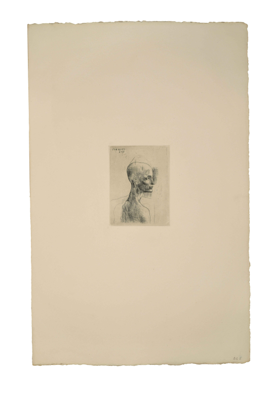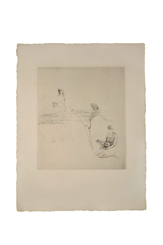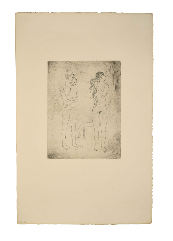 Les 15 gravures et pointes sèches connues sous le nom de « La Suite des Saltimbanques », dont « Le Repas frugal », « Salomé », « Les deux Saltimbanques », « Tête de femme de profil » et « La toilette de la mère », ont été réalisées immédiatement après le déménagement de Pablo Picasso, alors âgé de 22 ans, d’Espagne en France en avril 1904. Elles marquent une période importante de transition personnelle et artistique dans la vie de l’artiste. Créée à la charnière de ses périodes « bleue » (1901-1904) et « rose » (1904-1906), « La Suite des Saltimbanques » est intimement liée aux peintures et dessins de Picasso de la même période. Ces estampes offrent un aperçu extraordinaire des réflexions créatives d’un jeune artiste au seuil de la grandeur, ainsi que du milieu social dans lequel Picasso évoluait après s’être installé dans un atelier au Bateau-Lavoir à Montmartre, à Paris.