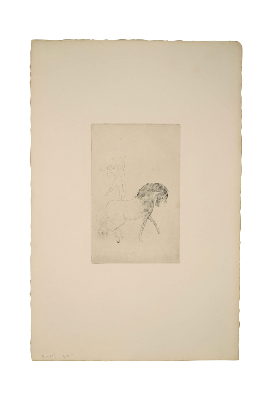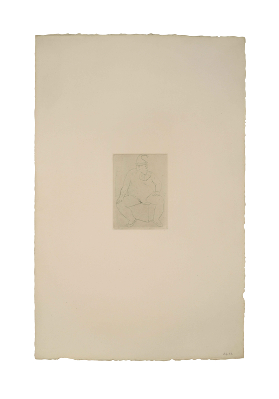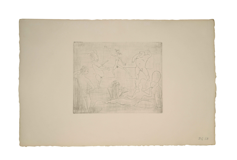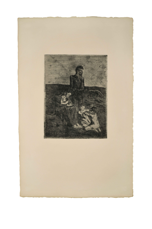Lorsque Picasso a réalisé Le Repas frugal, son intention était de créer une série de gravures qui se vendraient bien. En raison de sa situation financière précaire, la gravure a été réalisée sur une plaque de zinc qui avait précédemment été utilisée pour une composition paysagère de Joan González (1868-1908), un artiste espagnol qui résidait dans les ateliers du Bateau-Lavoir. Le grattage de la plaque n’a pas été complètement minutieux et les vestiges de la composition antérieure sont visibles dans les touffes d’herbe en haut à droite de l’image. Avec l’aide du maître imprimeur Auguste Delâtre (1822-1907), une petite première édition a été tirée, mais comme elle n’a suscité aucun intérêt commercial significatif, Picasso a abandonné l’idée de la gravure comme source de revenus alternative. Néanmoins captivé par le potentiel créatif de ce médium, Picasso créa au cours de l’année 1905 une série de gravures et de pointes sèches délicates, voire symboliques, représentant des amis, des connaissances, des artistes de cirque itinérants et des groupes familiaux. Reconnaissant immédiatement les qualités uniques inhérentes à la gravure et à la pointe sèche, il utilisa une économie et une élégance de ligne qui témoignaient de son talent de dessinateur et prouvaient sa maîtrise rapide de ce médium. Comme pour Le Repas frugal, les anciennes plaques ont été recyclées et grattées, ce qui a donné lieu à l’apparition de rayures (parfois spectaculaires) dans toute la série, ajoutant involontairement une merveilleuse modernité aux images.