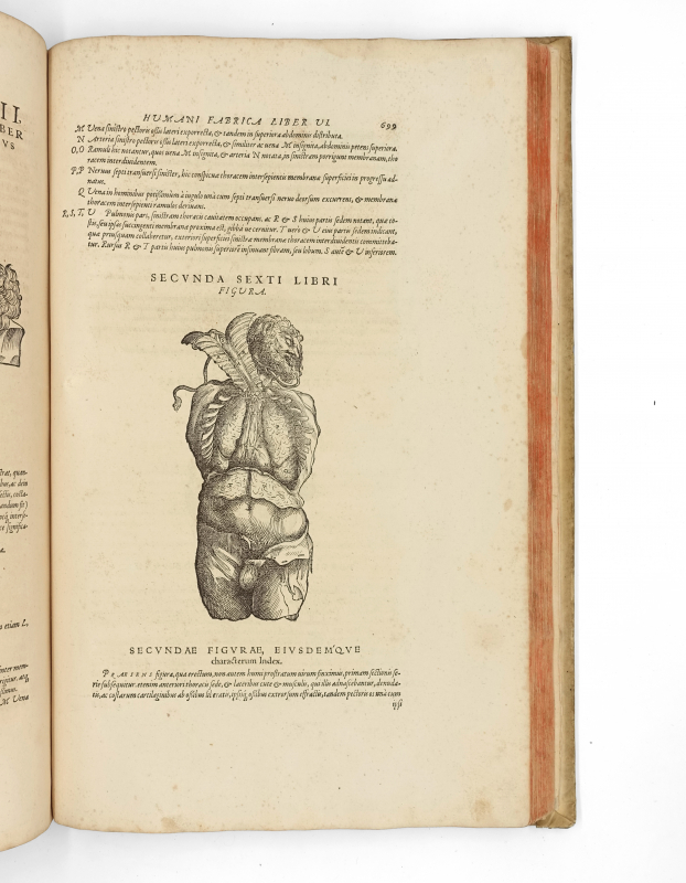 « With De humani corporis fabrica, published when he was only twenty-nine years old, Vesalius revolutionized not only the science of anatomy but how it was taught. Throughout this encyclopaedic work on the structure and workings of the human body, Vesalius provided a fuller and more detailed description of human anatomy than any of his predecessors, correcting errors in the traditional anatomical teachings of Galen… The Fabrica also broke new ground in its unprecedented blending of scientific exposition, art and typography. Although earlier anatomical books, such as those by Berengario da Carpi had contained some notable anatomical illustrations, they had never appeared in such number or been executed in such minute precision as in the Fabrica, and they had usually been introduced rather haphazardly with little or no relationship to the text… The book remains the masterpiece of Johannes Oporinus of Basel, one of the most widely learned and iconoclastic of the so-called ‘scholar-printers’, whose success with this book apparently caused Vesalius to entrust to Oporinus all of his alter publications… Although the illustrations have traditionally been attributed to an associate of Titian, Jan Stephan von Calcar who drew and possibly engraved the three woodcuts of skeletons in Vesalius first series of anatomical charts, Tabulae antomicae sex (1538), there is no reliable basis for this attribution. Modern scholarship attributes the Fabrica woodcuts only to an unknown artist or artists in the school of Titian. Vesalius commissioned the illustrations and supervised their production » (Norman, pour l’édition de 1543).