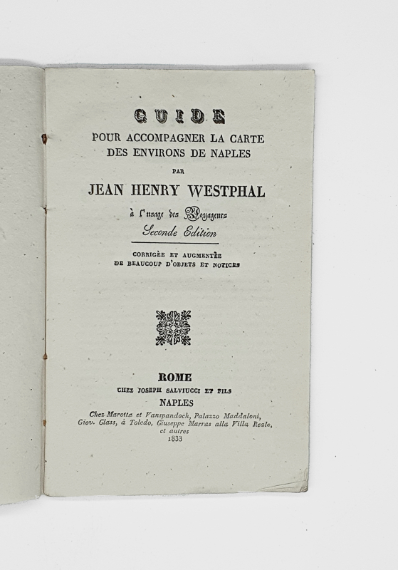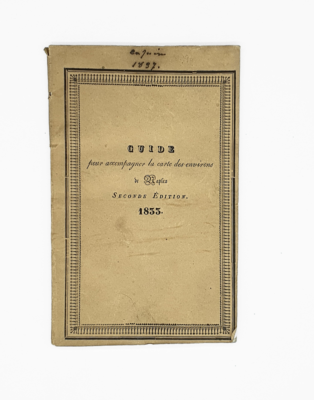 Guide pour accompagner la carte des environs de Naples (…) à l’usage des Voyageurs. Seconde édition corrigée et augmentée de beaucoup d’objets et notices. Rome, Joseph Salviucci et fils, et Naples, Marotta et Vanspandoch, Glass, Marras, 1833. In-8 de 60 pp. Broché, couvertures beiges imprimées.