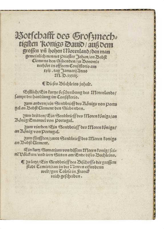 Le livre est divisé en deux parties. La première partie contient la description de l’Éthiopie, la relation du Prêtre Jean et les lettres au roi du Portugal. La seconde partie revêt une grande importance pour l’Amérique, car elle contient la lettre de Zumarraga au chapitre général des Franciscains à Toulouse, écrite en 1532, décrivant l’établissement et les progrès des missions au Mexique pour l’enseignement et la conversion des Indiens. Ce texte avait été publié pour la première fois en latin dans l’ouvrage de Cortés De Insulis nuper Inventis, 1532.